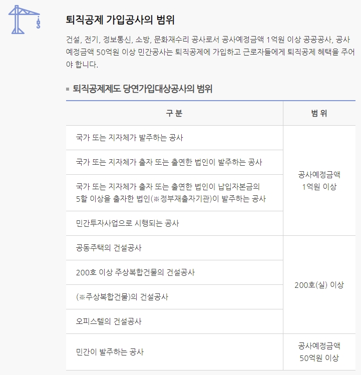 5. 퇴직공제 가입이 적용되는 공사의 범위는 꽤 넓어요. 건설뿐 아니라 전기, 통신, 소방, 문화재 복원 등 다양한 분야가 포함되며, 일정 금액 이상의 공사라면 대부분 자동으로 적용 대상이에요. 공공공사는 1억 원 이상, 민간공사는 50억 원 이상부터 적용된다고 보시면 됩니다. 덕분에 대형 현장에서 일하시는 분들은 거의 대부분 자동으로 가입되는 셈이에요.