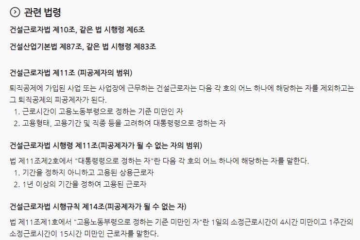 7. 관련 법령도 꽤 명확하게 정리돼 있어요. 예를 들어 건설근로자법과 그 시행령에서는 가입 대상, 예외 대상, 근무 시간 기준 등이 다 나와 있고, 시행규칙에서는 소정 근로시간까지 구체적으로 언급돼 있어요. 1일 4시간, 주 15시간 미만이면 제외된다는 기준도 여기에 포함되니 참고하시면 좋을 것 같아요. 혹시 궁금하면 공제회 홈페이지에서 직접 확인할 수 있습니다.