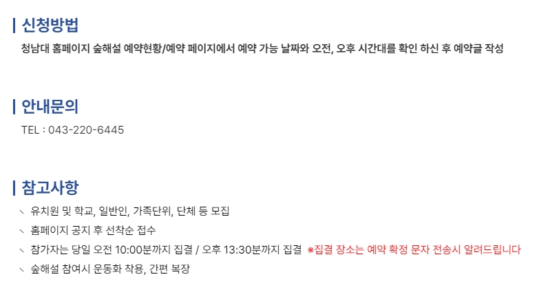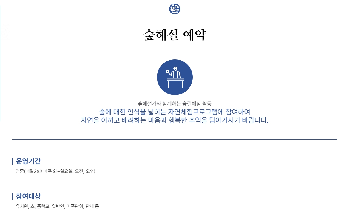 11. 마지막으로, 숲해설 예약은 홈페이지에 있는 예약 현황/신청 페이지를 통해 진행하시면 됩니다. 원하는 날짜와 시간이 남아 있는지 미리 확인하고, 서둘러 신청하시는 걸 추천드려요. 선착순이라 놓치면 아쉬울 수 있거든요.