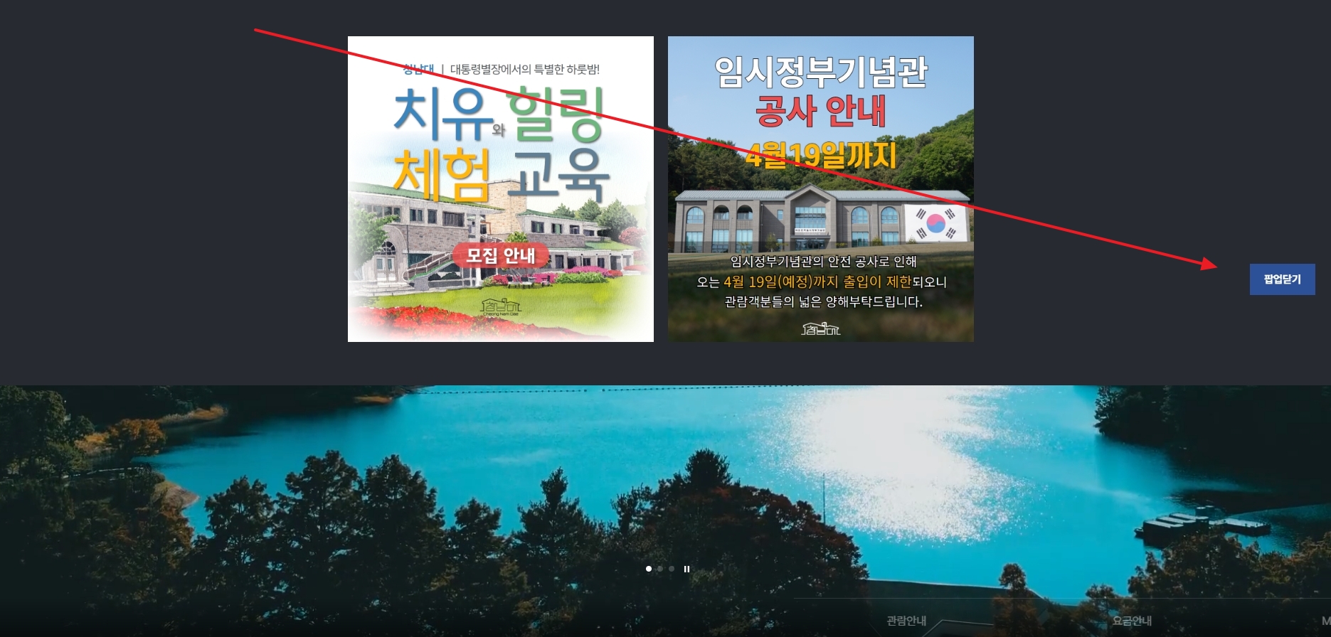 2. 홈페이지에 들어가면 팝업창이 자동으로 뜨는 경우가 있어요. 중요한 공지사항이 포함돼 있을 수는 있지만, 메뉴를 가리면 사용하기 불편하니 우측 상단에 있는 ‘X’ 버튼을 눌러서 닫아주시면 됩니다. 그럼 홈페이지 메뉴들이 잘 보일 거예요.
