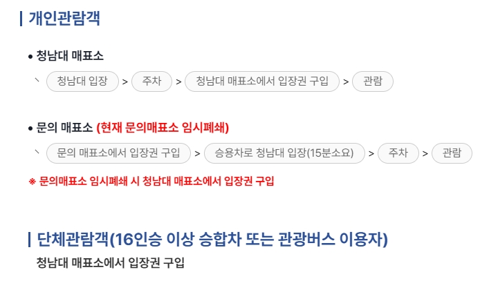 7. 개인 또는 단체로 입장하실 경우에는 매표소 이용 방법도 조금 달라요. 문의 매표소가 문을 닫았을 땐 청남대 매표소를 이용하셔야 하니, 방문 당일 안내문 꼭 확인하세요.