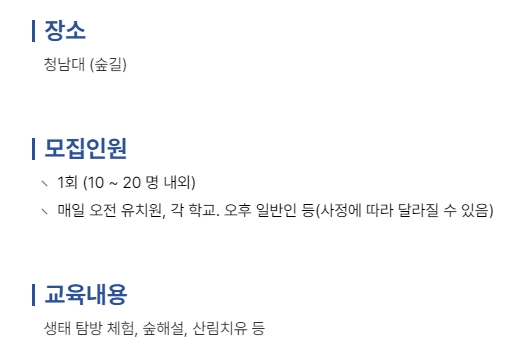 10. 프로그램이 진행되는 숲길이나 체험 장소에 대한 정보도 확인할 수 있어요. 숲해설, 생태탐방, 산림치유까지 다채로운 활동이 있어서 아이들뿐 아니라 어른들도 재미있게 즐길 수 있어요.