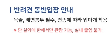 5. 반려견을 동반하신다면 주의하셔야 할 점이 있어요. 실내는 출입이 제한되고, 야외도 목줄은 필수고 견종에 따라 입마개도 필요할 수 있어요. 배변봉투 챙기시는 것도 잊지 마시고요!