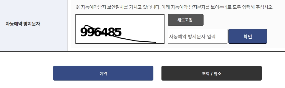 6. 마지막으로는 자동 예약 방지를 위한 인증 문자 입력 단계가 있어요. 여기에 보이는 문자 그대로 입력하면 되는데요, 이걸로 예약 절차가 완료됩니다. 간단하지만 이 과정이 빠지면 예약이 성립되지 않으니 꼭 확인하고 넘어가세요!