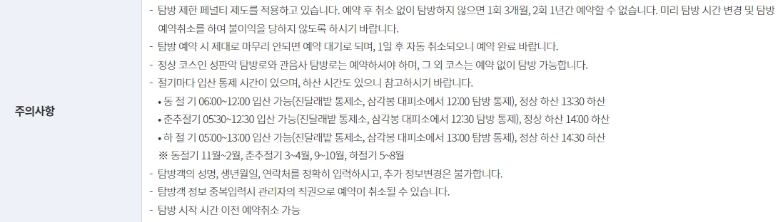 5. 예약 후 아무 이유 없이 탐방을 하지 않으면 패널티가 있어요. 한 번 위반 시 3개월간 예약이 제한되고, 두 번 위반하면 무려 1년 동안 예약이 막히니까 꼭 신중하게 예약하시고 불참 시에는 꼭 취소 처리 해주셔야 해요. 예약 후 아무 조치 없이 미탐방할 경우, 다음 예약이 어려워질 수 있습니다.
