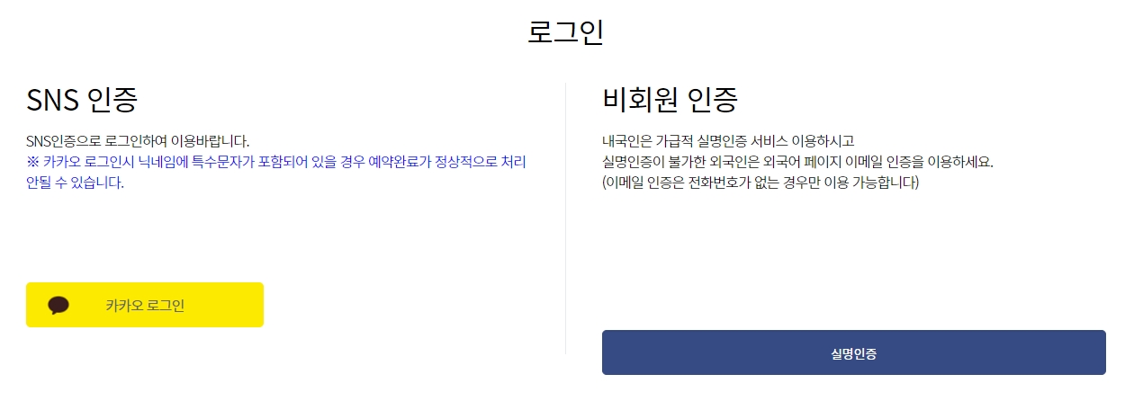3. 로그인 방식은 아주 간단해요. 복잡한 회원가입 없이 카카오톡 계정으로 로그인하거나, 비회원 실명 인증을 통해 바로 예약 가능하니까 누구나 손쉽게 이용할 수 있습니다. 빠르게 예약 진행하고 싶으신 분들에게 아주 편한 시스템이에요.