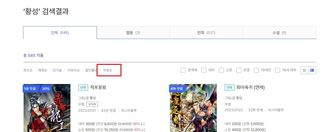 8. 검색 결과에서 무료순으로 정렬하는 것도 꼭 해보세요. 이 기능을 활용하면 현재 가장 많은 분들이 무료로 보고 있는 작품 순으로 정리되니까 인기 있는 콘텐츠를 쉽게 찾을 수 있어요.
