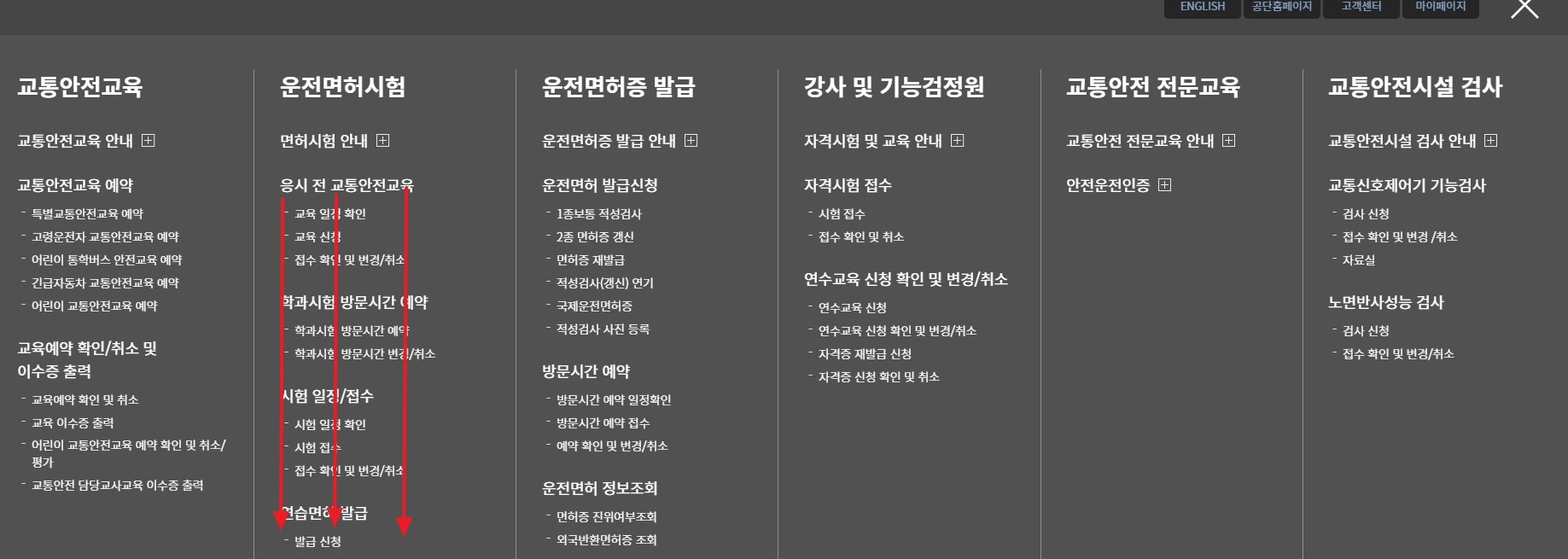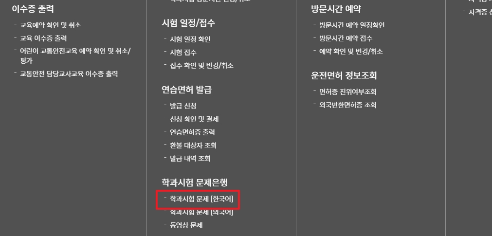 3. 전체 메뉴가 열리면 스크롤을 내려서 운전면허시험과 관련된 항목을 찾아주세요. 메뉴가 다양한 만큼 천천히 하나씩 살펴보시는 걸 추천드려요. 특히 학과시험 문제은행 항목이 가장 핵심이에요.