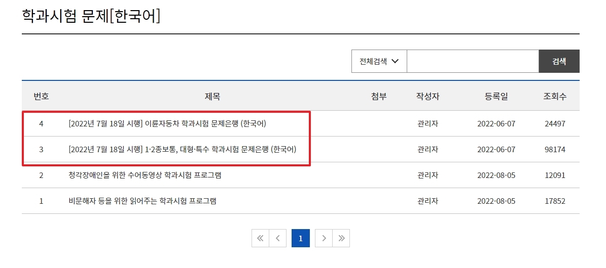 4. 학과시험 문제은행 - 학과시험 문제 [한국어] 메뉴를 클릭해 주세요. 여기에 들어가면 이륜자동차부터 1종·2종 보통, 대형 차량, 특수 차량까지 다양한 시험 범위의 문제들이 잘 정리되어 있어요. 본인에게 해당하는 유형을 선택하시면 됩니다.