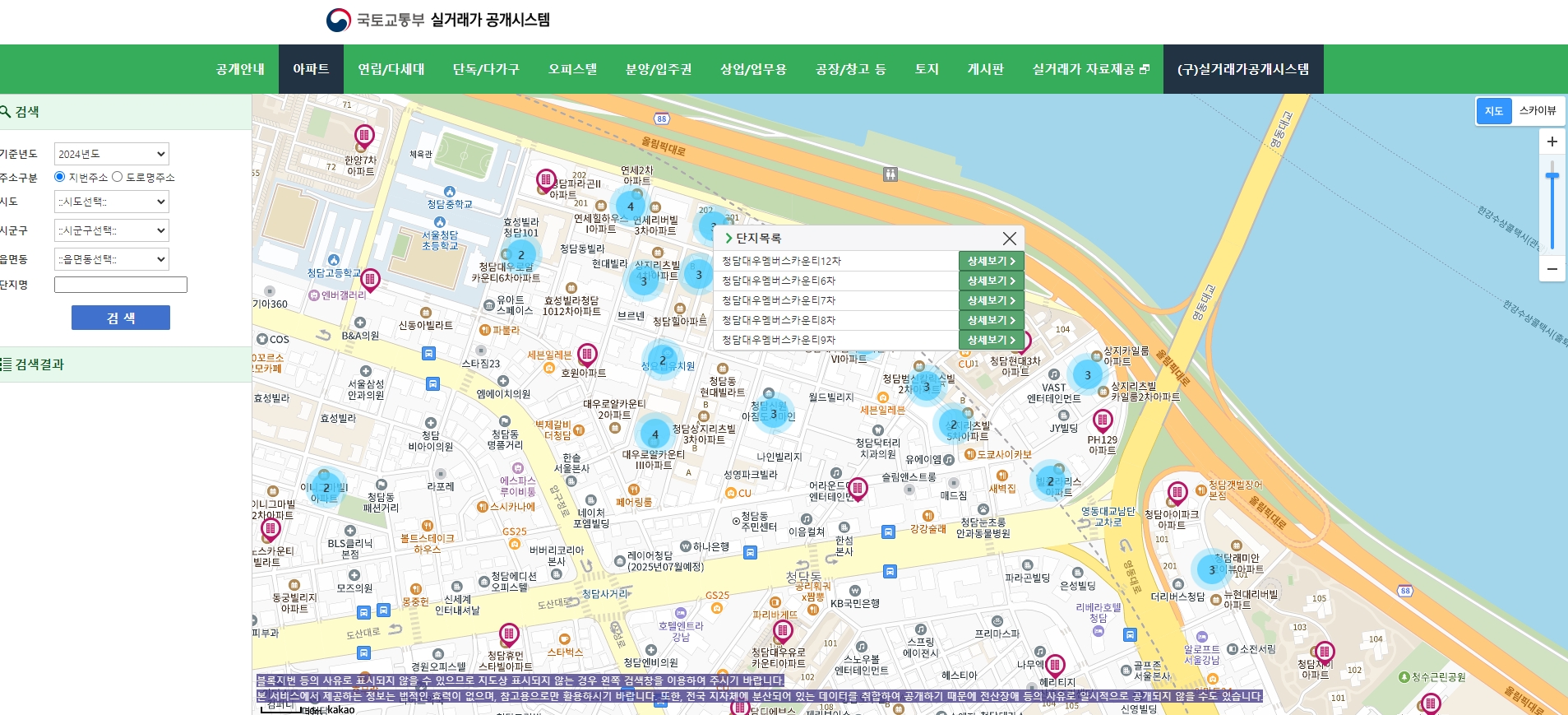 3. 아파트를 예로 들어볼게요! 메뉴에서 아파트를 누르면 좌측에 검색창이 보여요. 여기에 단지명을 입력하거나, 지도에서 직접 지역을 클릭해서 조회할 수 있는데요. 저도 처음엔 단지명을 몰라서 지도 기능을 많이 활용했어요. 원하는 위치를 클릭하면 그 주변 아파트들의 거래 내역이 쭉 나옵니다.