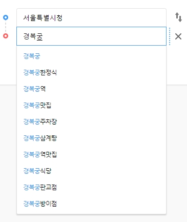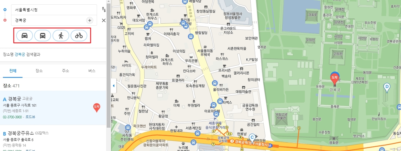 7. 도착지 입력란에 목적지를 입력해 주세요. 저는 예시로 경복궁을 넣어봤는데요, 이렇게 하면 자동으로 최적의 경로를 추천해줍니다. 덕분에 복잡한 서울 시내도 헤매지 않고 이동할 수 있어요.