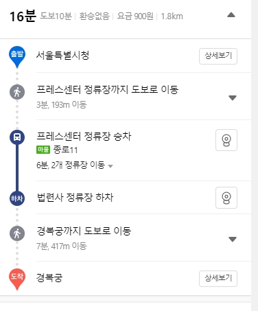 10. 마지막으로 선택한 경로의 세부 정보를 보면 도보 이동 거리, 승차와 하차 정류장, 예상 소요 시간까지 모두 확인할 수 있습니다. 게다가 거리뷰 기능까지 있어서 실제 길거리를 미리 볼 수 있으니 길 잃을 걱정은 안 하셔도 될 것 같아요!