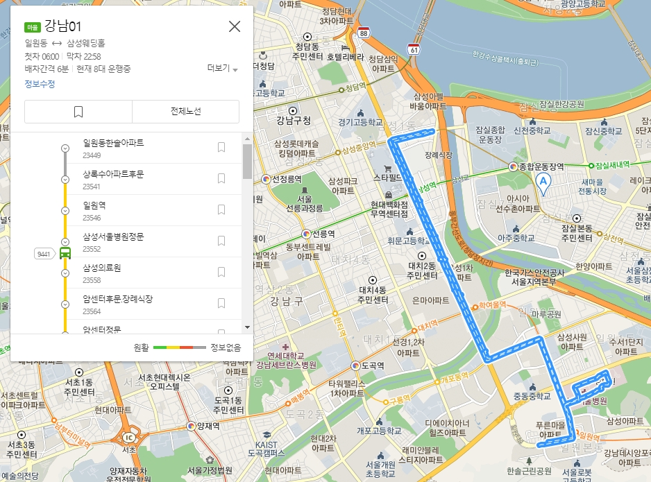 2. 검색창에 자신이 찾고 싶은 버스 번호를 입력해 주세요. 예를 들어 강남 주변을 다니는 강남01처럼요. 버스 번호만 입력하면 노선도와 운행 정보가 한눈에 쏙 들어와서 정말 편리합니다.