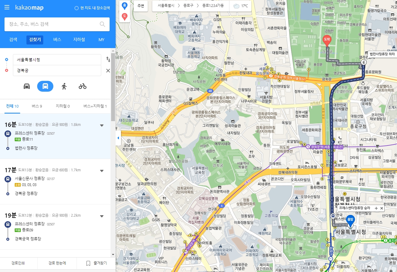 7. 도착지 입력란에 목적지를 입력해 주세요. 저는 예시로 경복궁을 넣어봤는데요, 이렇게 하면 자동으로 최적의 경로를 추천해줍니다. 덕분에 복잡한 서울 시내도 헤매지 않고 이동할 수 있어요.