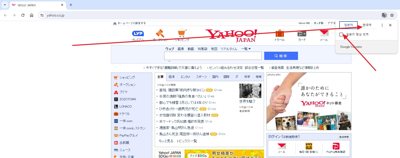 1. 야후 재팬 공식 홈페이지에 접속해 주세요. 일본에서 가장 많이 사용하는 포털 사이트라서 뉴스, 날씨, 쇼핑, 금융 등 정말 다양한 정보를 한눈에 확인할 수 있어요. 일본 현지 소식을 빠르게 접하고 싶다면 이곳만한 곳이 없답니다. 일본어로 되어 있지만 걱정 마세요. 곧 한글로 변신할 거니까요!