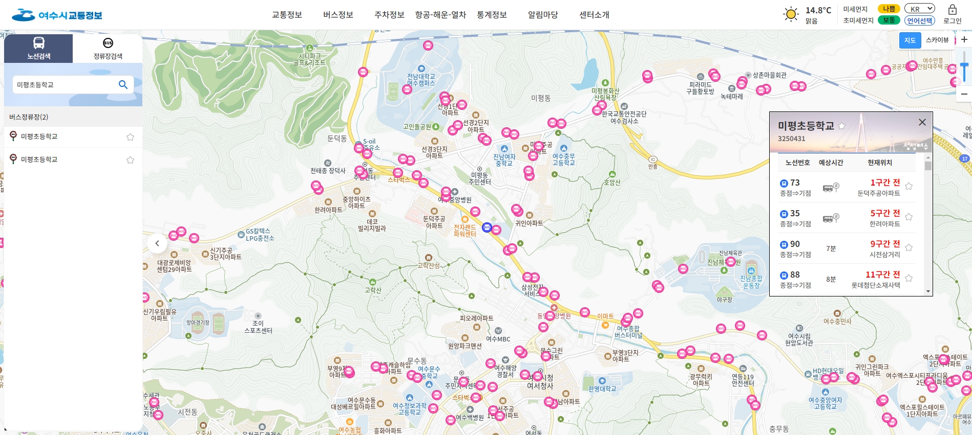6. 정류장 이름을 검색창에 입력하고 선택하면, 그 정류장을 지나는 버스들과 각 버스의 예상 도착 시간을 바로 확인할 수 있어요. 급하게 버스 시간 확인해야 할 때 정말 유용한 기능이에요. 덕분에 여수 시내 어디를 가든지 기다림 없이 딱 맞춰 이동할 수 있었습니다.