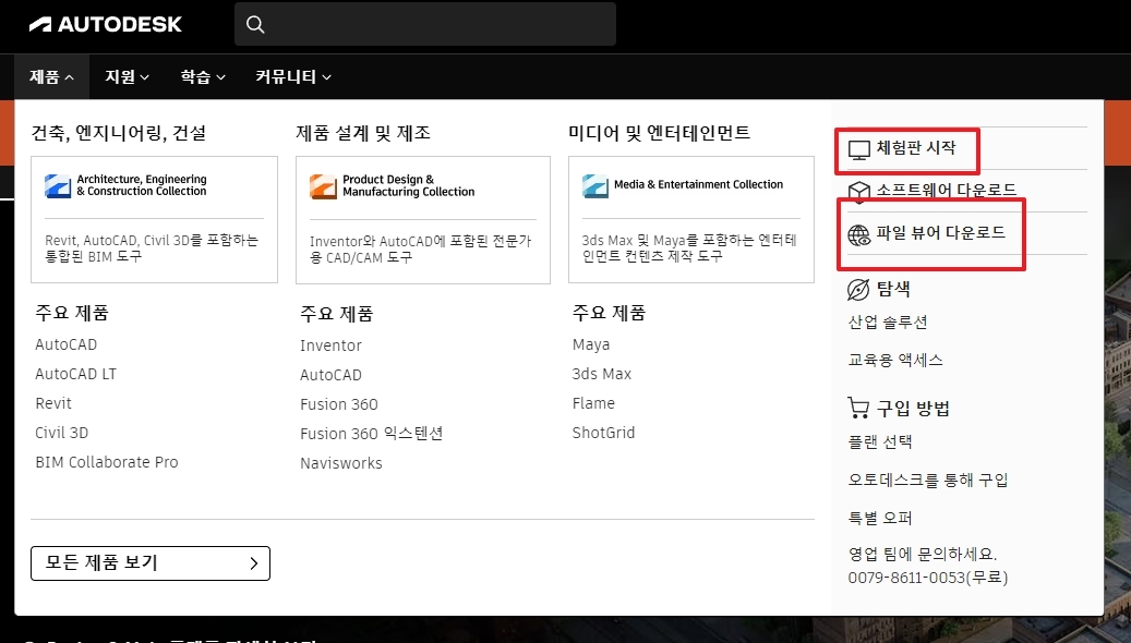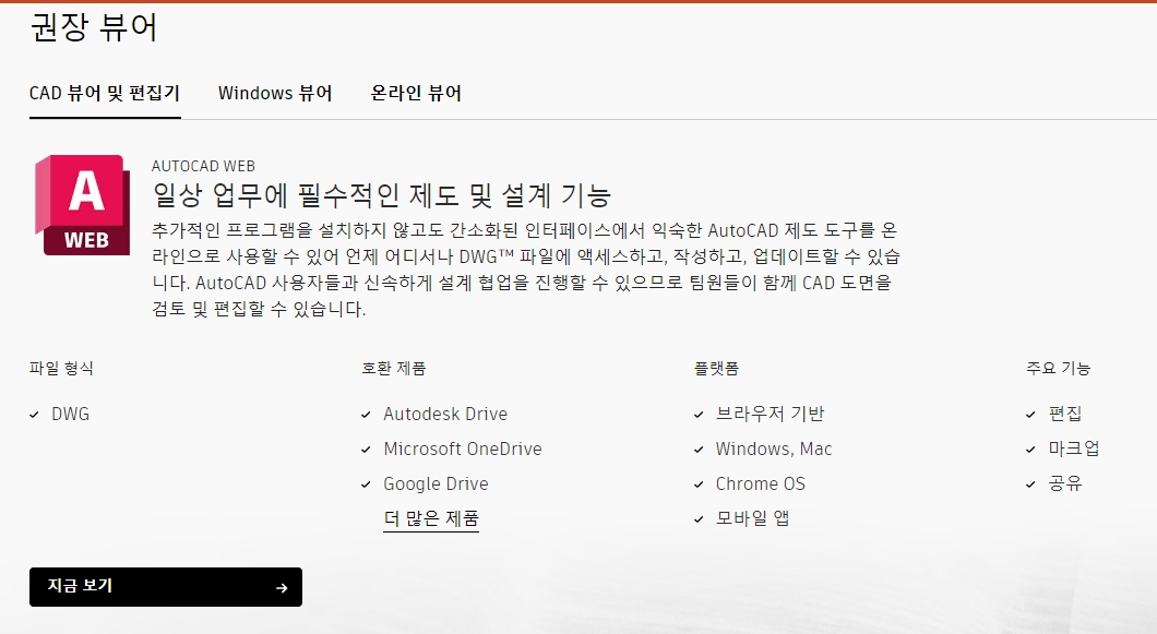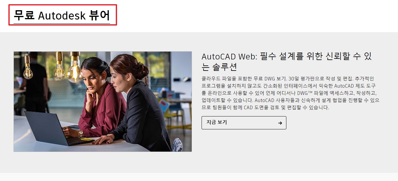 4. 새로운 페이지로 이동되면 ‘무료 Autodesk 뷰어’라는 항목이 보일 거예요. 이 항목을 클릭하시면 다운로드 가능한 옵션들을 자세히 확인할 수 있습니다. 간단하게 비교해보기도 좋아요.