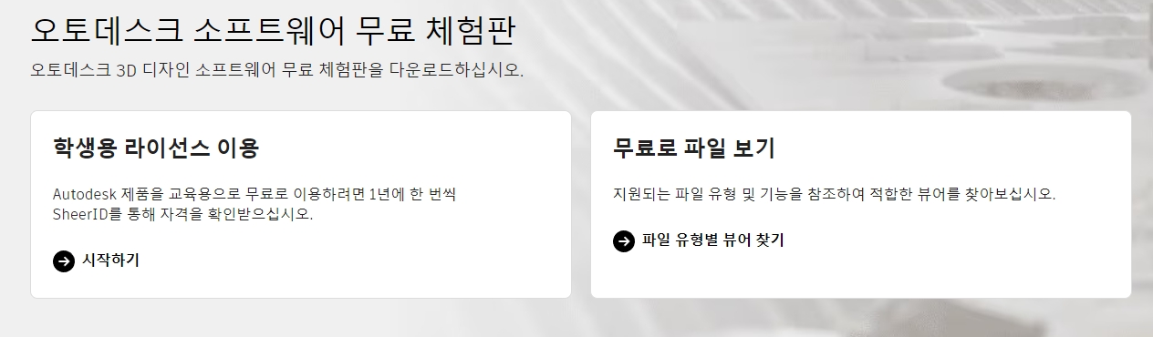 7. ‘체험판 시작’ 버튼을 클릭하면 학생용 라이선스나 무료 보기 옵션이 나와요. 여기서 ‘무료로 파일 보기’를 선택하면, 설치 없이도 바로 DWG 파일을 열람할 수 있어요. 간단한 열람용이라면 이게 제일 편해요.