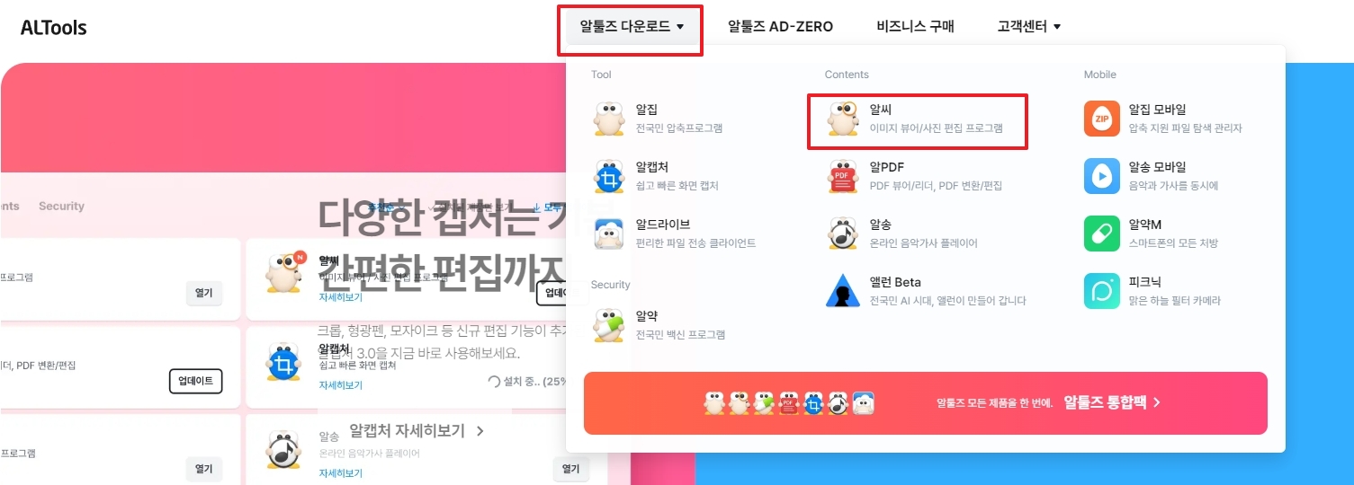 1. 알툴즈 공식 홈페이지에 접속하시면 다양한 유틸리티 프로그램을 한눈에 확인할 수 있습니다. 알집, 알송, 알캡처 등과 함께 사진 편집 및 동영상 제작 기능이 포함된 알씨도 여기서 받을 수 있어요. 무료로 제공되고 있고 사용 방법도 간단해서 누구나 쉽게 사용할 수 있는 게 장점입니다.