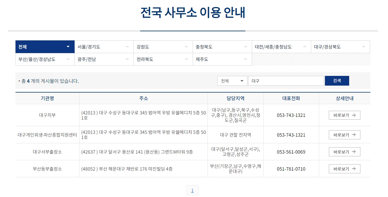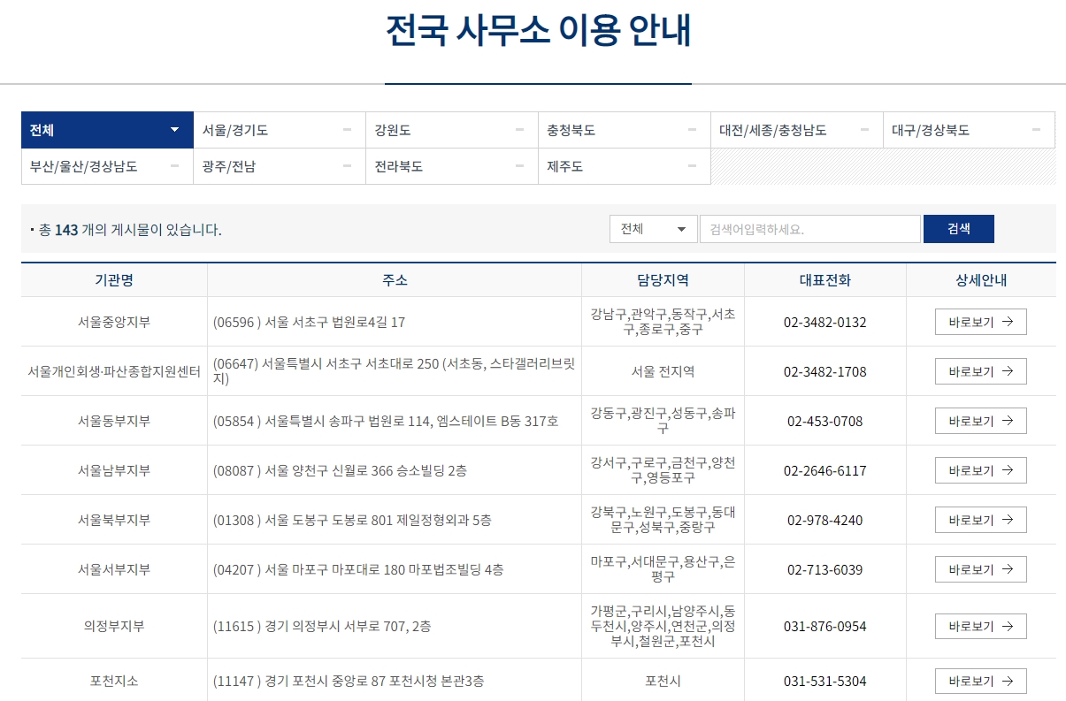 8. 전국에 총 143곳의 사무소가 운영되고 있어요. 대구를 찾으시려면 대구/경상북도를 선택하거나 검색창에 ‘대구’를 입력하시면 됩니다. 생각보다 다양한 지점이 운영되고 있어 선택의 폭이 꽤 넓습니다.