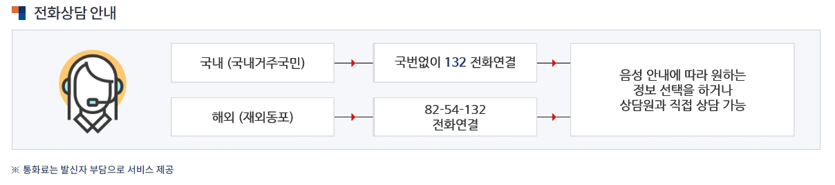 5. 전화 상담을 원하시면 국내에서는 국번 없이 132번으로 걸면 되고요, 해외에 계신 재외국민분들은 82-54-132로 전화를 걸면 상담을 받을 수 있어요. 간단한 문의부터 깊이 있는 상담까지 전화 한 통으로 해결할 수 있으니 정말 편리한 것 같아요.