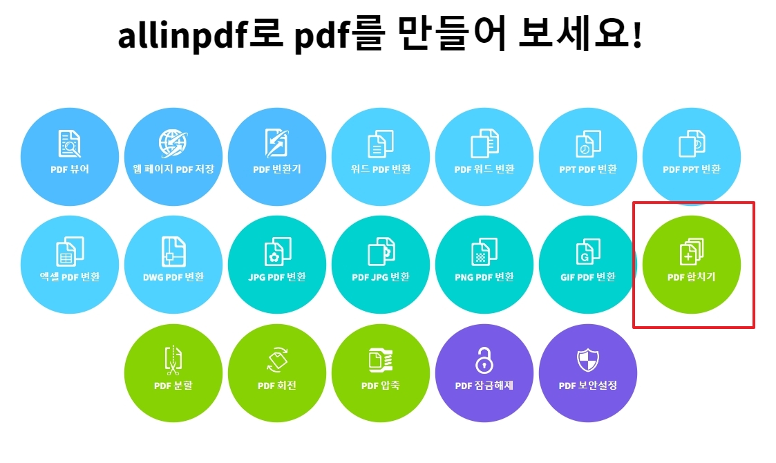 allinpdf 홈페이지 내에는 다양한 아이콘과 기능들이 있습니다. 이 중 pdf 합치기 아이콘을 클릭합니다.