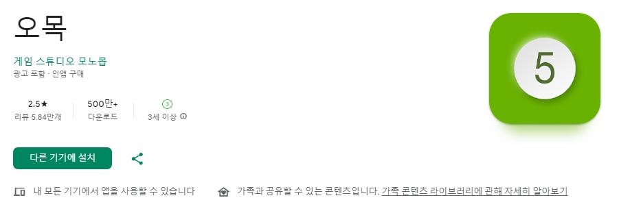2. 검색창에 오목이라고 입력하면 여러 가지 앱이 나옵니다. 다운로드 수가 많고 평점이 높은 앱을 선택하는 게 좋습니다.