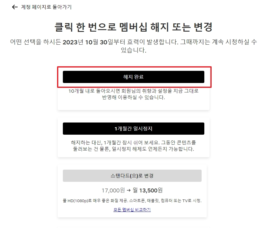 4. 멤버십 해지를 클릭하면 다음 단계로 넘어가는데요. 이 화면에서는 해지 후 이용 가능 기간이나 일시정지 옵션에 대한 안내가 함께 제공됩니다. 화면 아래쪽에 있는 해지 완료 버튼을 눌러주세요.