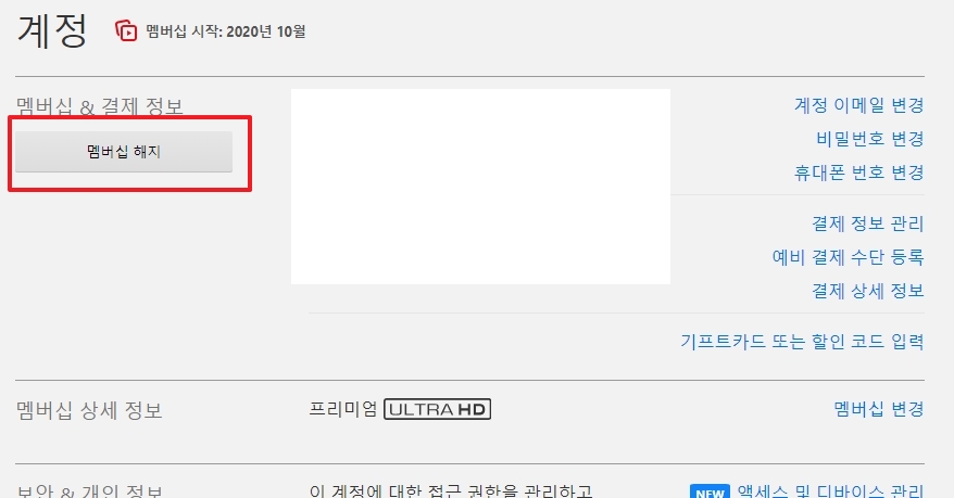 3. 계정 설정 페이지로 이동하면 결제 정보나 시청 기록 등을 확인할 수 있는데요. 여기서 멤버십 & 결제정보 항목 아래에 있는 멤버십 해지 버튼을 찾아 클릭합니다.