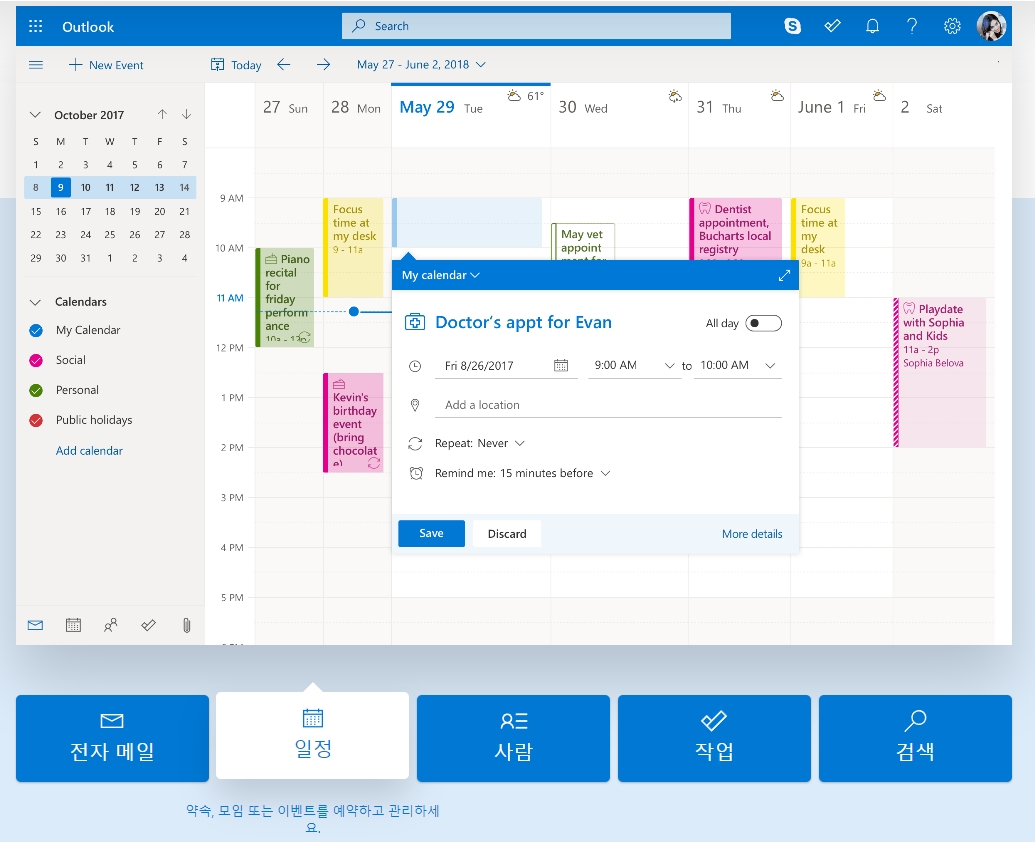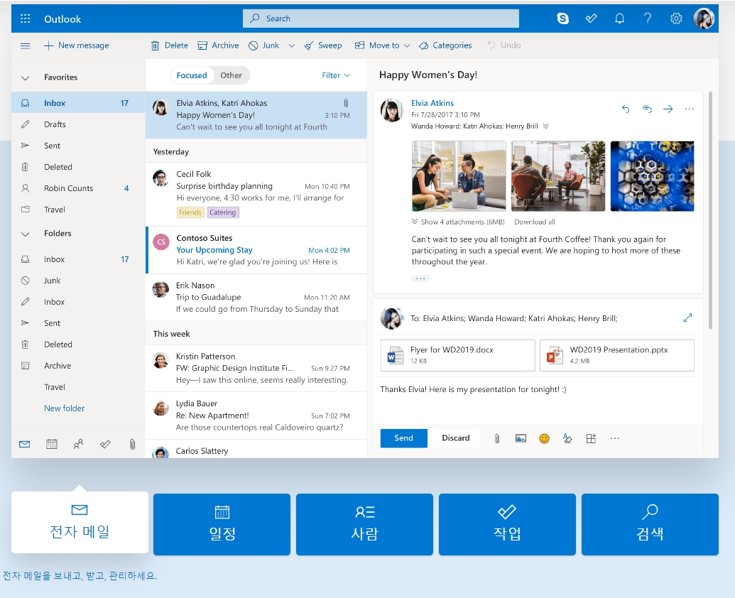 이메일과 캘린더를 따로 쓰는 경우가 많지만, 아웃룩에서는 두 기능을 한 화면에서 함께 사용할 수 있어 일정 확인과 메일 확인을 동시에 할 수 있는 장점이 있습니다. 저도 따로 쓰다가 통합해 쓰니 편하더라고요.