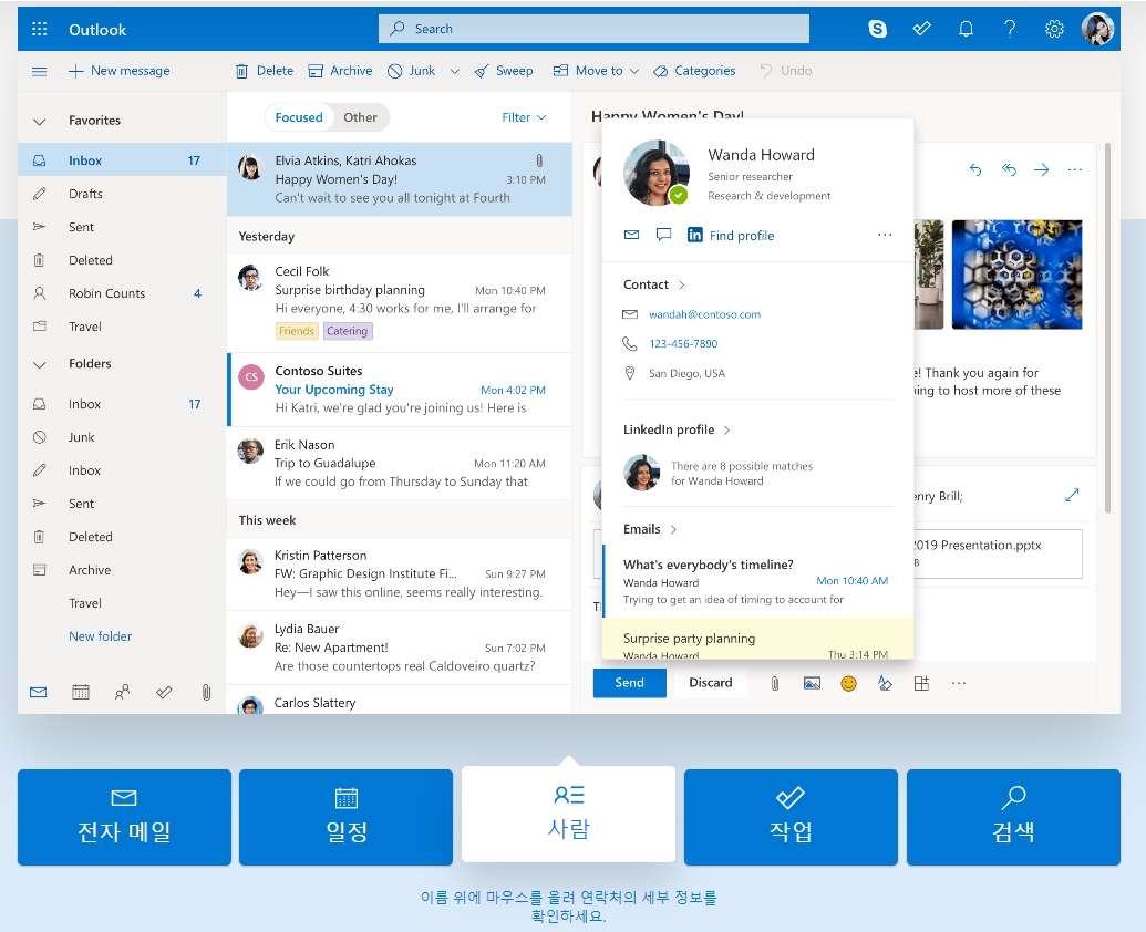 이름에 커서를 올리면 연락처의 세부 정보를 볼 수 있고, 채팅처럼 메시지를 주고받을 수 있는 기능도 제공됩니다. 일종의 메신저 기능까지도 포함되어 있어 협업용으로도 괜찮습니다.