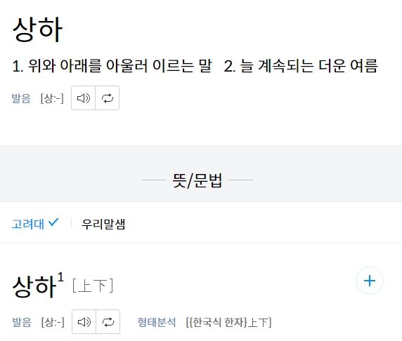 '상하'와 같은 복합어를 입력하면, 그 단어에 해당하는 정확한 한자 조합이 나타나고, 각 단어의 뜻과 예시도 함께 제공됩니다. 특히 상하좌우, 상하노소처럼 관용적 표현까지 검색되어 학습 효율을 더욱 높여줍니다.