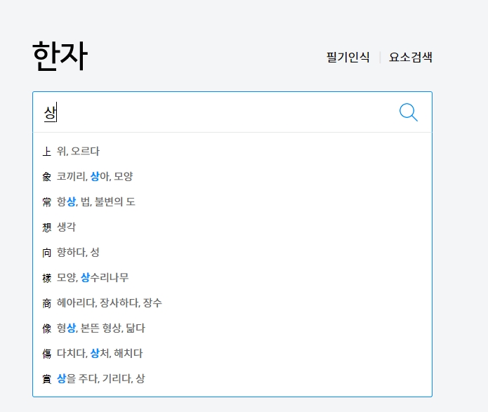 ‘상’이라는 한글만으로도 위상, 항상, 상징 등 다양한 쓰임의 한자가 함께 표시됩니다. 이 기능은 유사 음에 대한 연관성까지 파악해 보여주기 때문에, 단어의 쓰임새를 정확하게 알고 싶은 경우 특히 유용합니다.