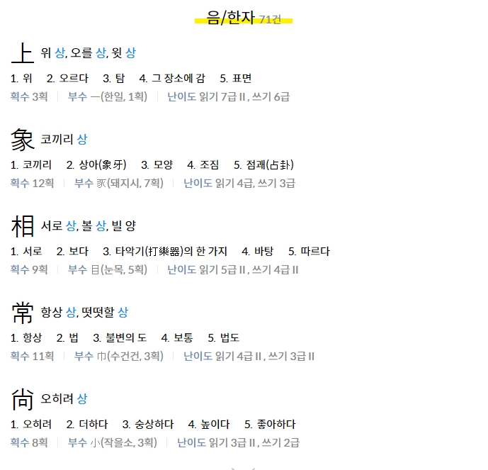 ‘상’이라는 한글만으로도 위상, 항상, 상징 등 다양한 쓰임의 한자가 함께 표시됩니다. 이 기능은 유사 음에 대한 연관성까지 파악해 보여주기 때문에, 단어의 쓰임새를 정확하게 알고 싶은 경우 특히 유용합니다.