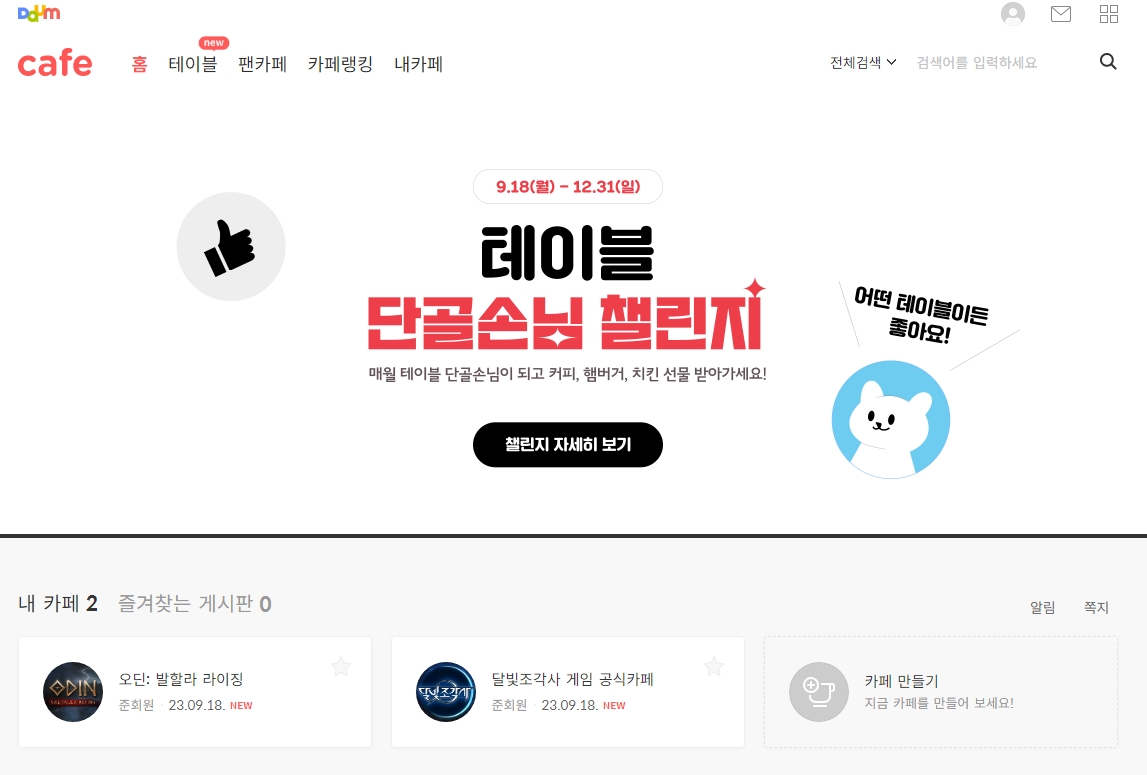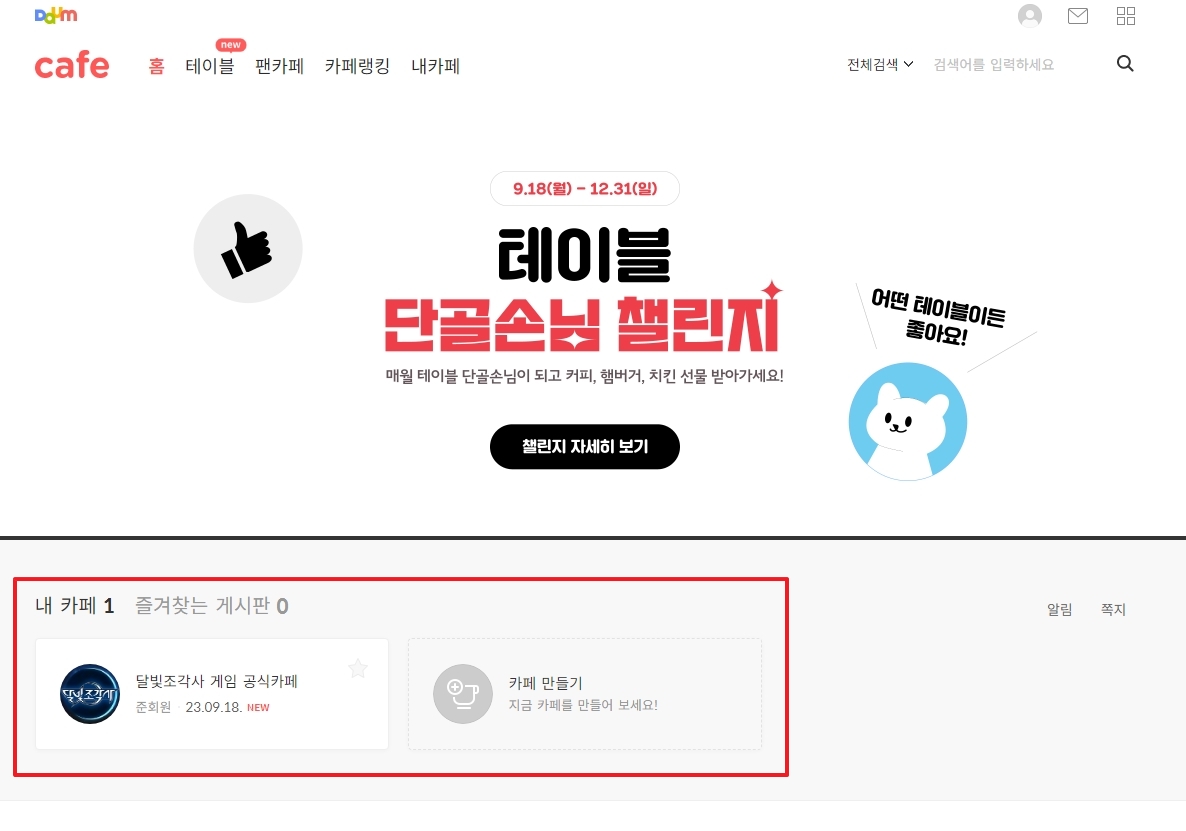 해당 화면에서는 내가 가입한 카페 수가 숫자로 표시되며, 바로 아래에 리스트가 나타납니다. 그 위에는 최근에 도입된 ‘테이블’ 기능도 함께 표시되는데, 이는 특정 주제 중심으로 소통할 수 있는 공간으로 다음에서 적극적으로 확장 중인 기능입니다.