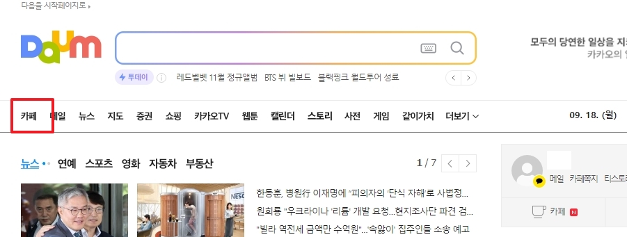 다음 메인 페이지에 접속한 뒤, 상단 메뉴에서 ‘카페’ 항목을 클릭해 주세요. 별도 로그인 없이도 본인의 계정으로 접속되어 있다면, 이후 단계가 자동으로 연결됩니다.