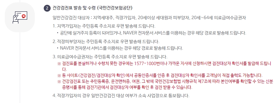 지역세대주, 직장가입자, 20세 이상 세대원 및 피부양자, 그리고 20세~64세 의료급여수급권자는 대상입니다. 비사무직은 매년, 그 외는 2년에 한 번 검진을 받습니다.