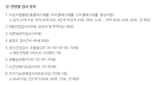 이상지질혈증 검사는 남성 25세 이상, 여성 40세 이상부터 4년 주기로 시행됩니다. 우울증 검사는 10년 주기로 20~70세 각 나이에 맞춰 1회씩 시행됩니다.