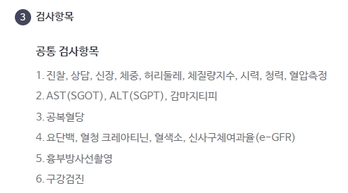 진찰, 상담, 혈압, 시력, 체중, 흉부X선, 혈액검사, 구강검진 등 기본 항목이 모두 포함됩니다.
