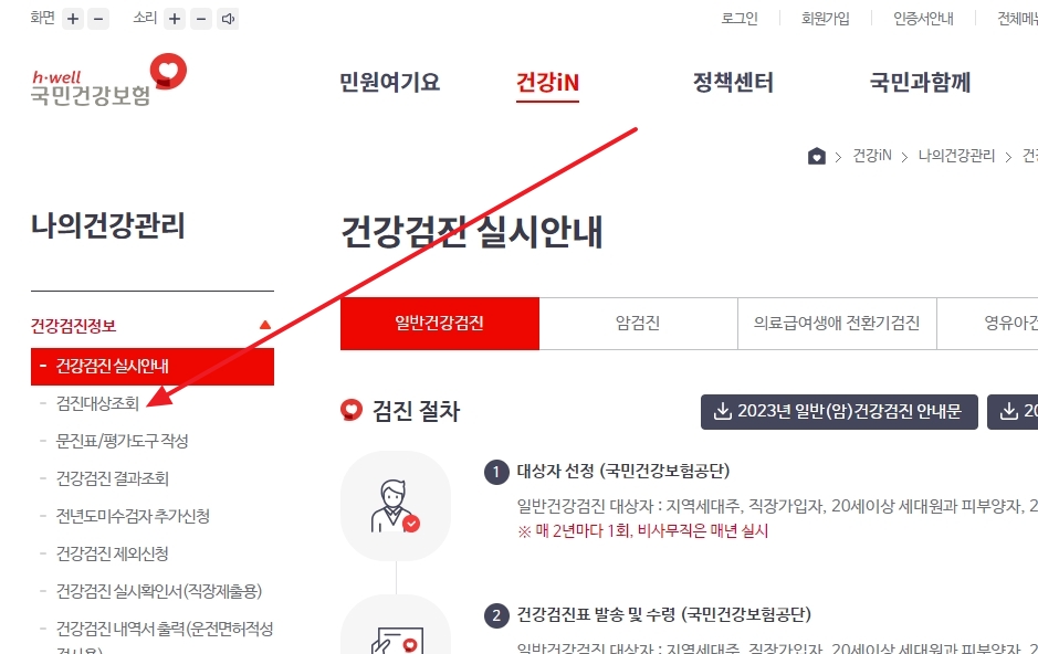 좌측 메뉴에서 ‘검진대상조회’를 클릭하면 올해 본인이 검진 대상인지를 확인할 수 있습니다.