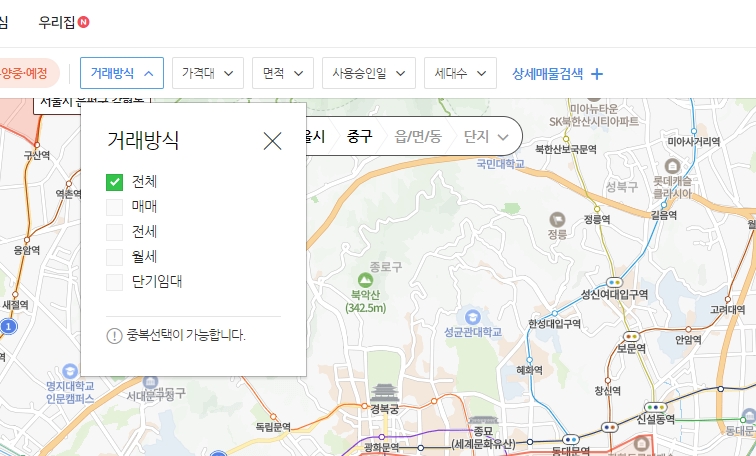 매매, 전세, 월세, 단기임대 등 거래 방식을 선택할 수 있습니다. 모두 중복 선택 가능하며, 전체를 한 번에 보는 것도 가능합니다. 필터 하나만 달라도 결과가 완전히 달라질 수 있으니 신중하게 설정해야 합니다.