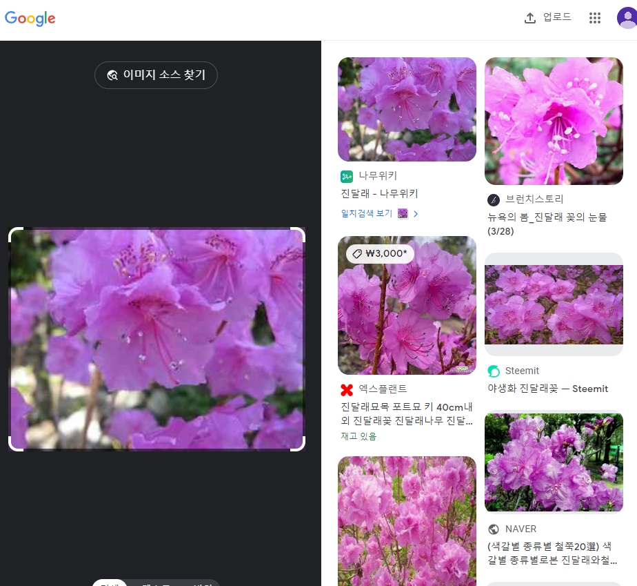 검색을 실행하면 사진과 유사한 이미지 또는 정보를 기반으로 결과가 표시됩니다. 예를 들어 진달래 사진을 올리면 유사 이미지들과 함께 해당 꽃의 이름과 관련 정보를 자연스럽게 확인할 수 있습니다.