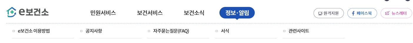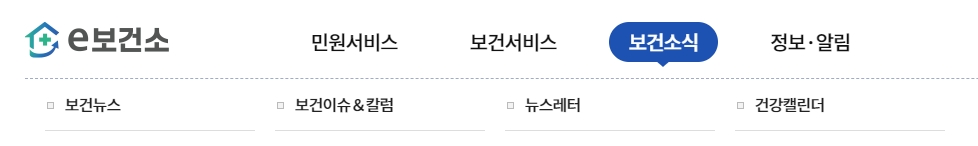 화면 상단 메뉴바에는 민원서비스, 보건서비스, 보건소식, 정보·알림 등이 있어요. 필요한 기능은 여기서 쉽게 찾을 수 있고, 클릭 한 번으로 접근할 수 있어요.