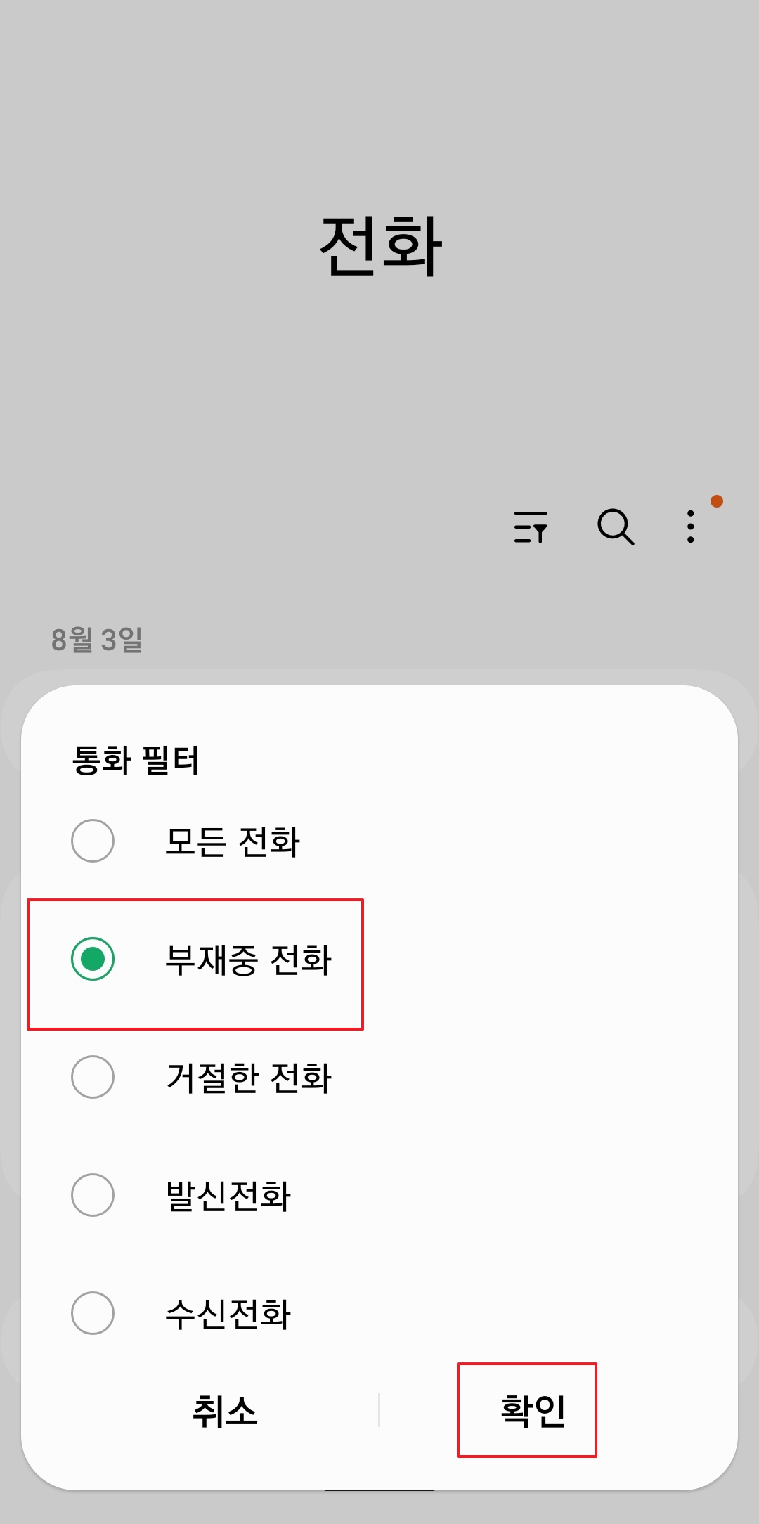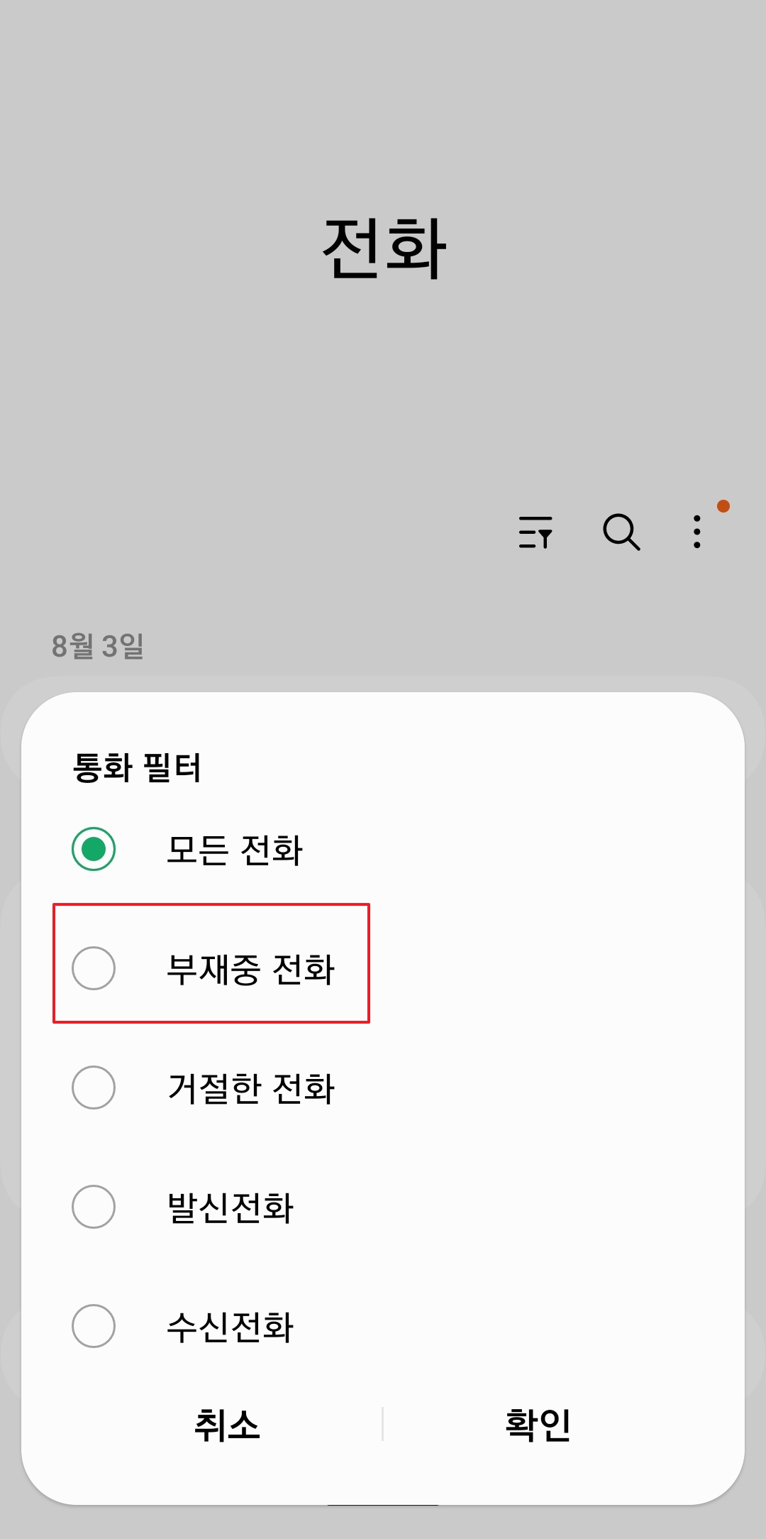 우측 상단에 있는 깔때기 모양의 필터 아이콘을 누르면, 원하는 통화 유형만 따로 볼 수 있어요. 부재중 전화도 여기서 골라볼 수 있습니다.