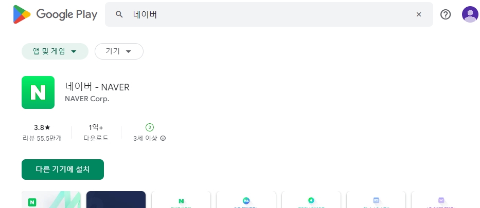 검색창에 ‘네이버’ 혹은 ‘다음’을 입력해서 어플을 다운로드합니다. 구글은 웹으로도 사용 가능하지만, 네이버나 다음은 앱 설치가 필수입니다.