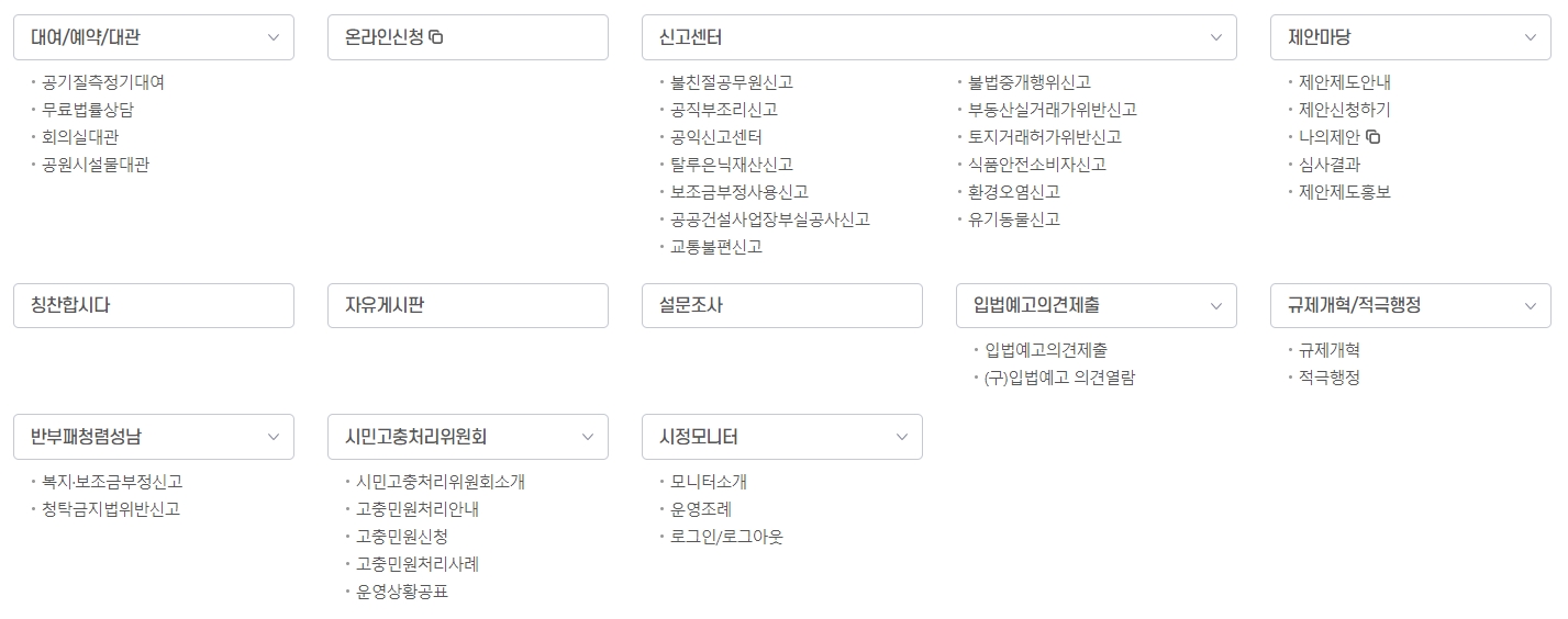 대여, 예약, 신고, 제안 등 시민들이 자주 이용하는 공공서비스를 손쉽게 신청할 수 있도록 마련돼 있어요. 제안마당 기능도 있어서 시민의견을 시정에 반영하려는 구조가 돋보여요.