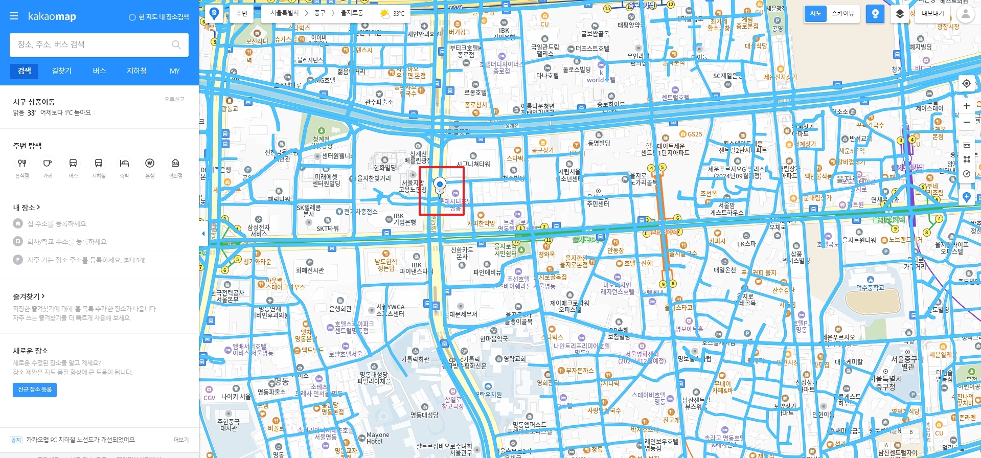 상단 검색창에 확인하려는 장소명(예: 을지로)을 입력해 검색합니다. 장소명이 모호하면 근처 건물명이나 도로명까지 입력해야 정확한 결과가 나오며, 검색어 자동완성 기능을 활용하면 더욱 편리합니다.