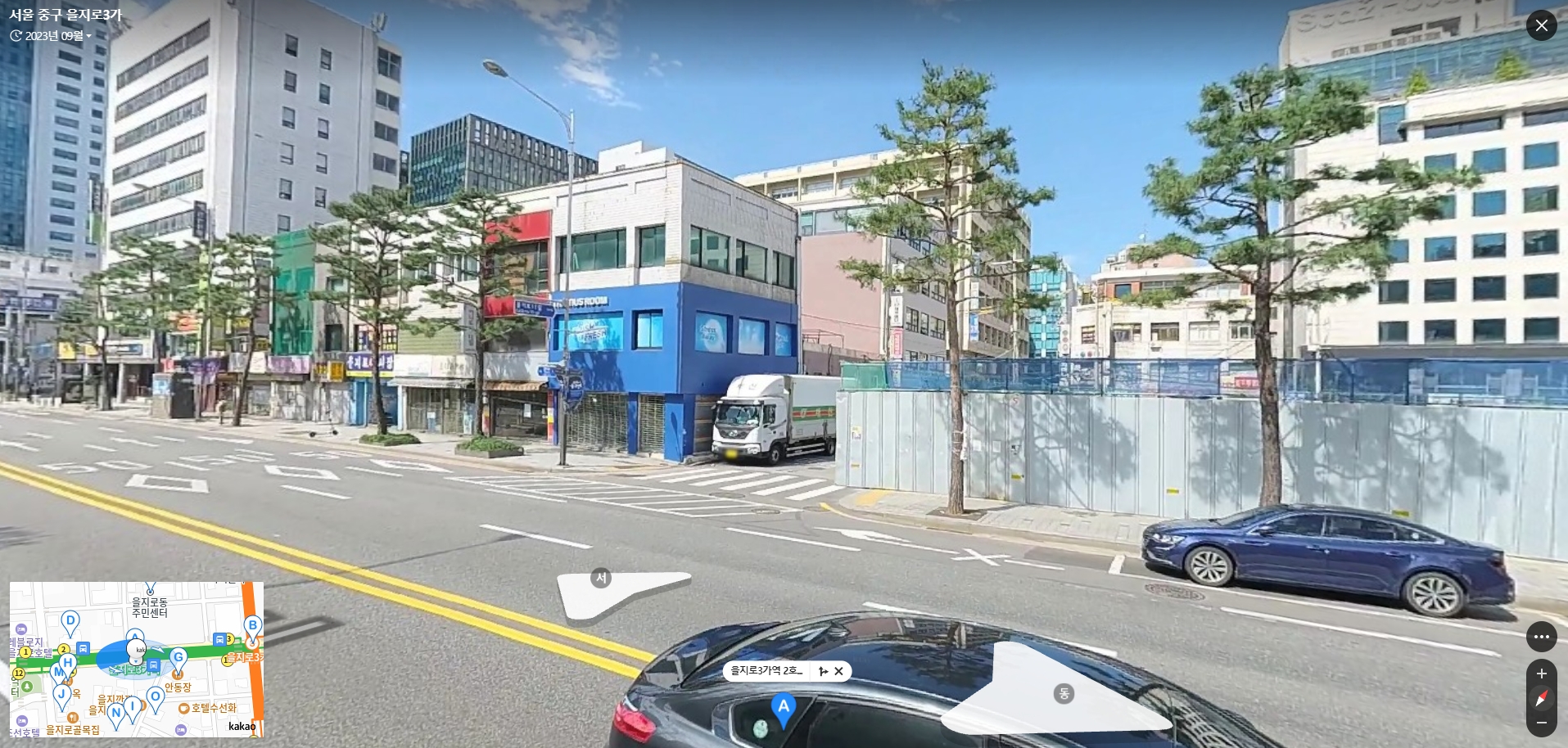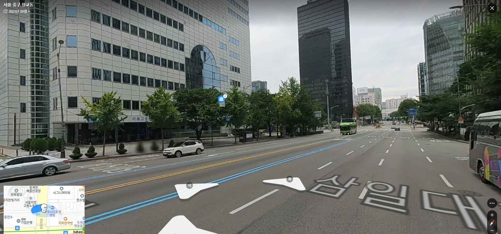 로드뷰 페이지에 진입한 후 마우스 드래그나 터치 스와이프로 이동할 수 있으며, 더블클릭 또는 돋보기 아이콘으로 확대·축소가 가능합니다. 이동 가능한 화살표 경로는 파란색으로 표시되어 있어, 길을 따라 직관적으로 이동할 수 있어요.