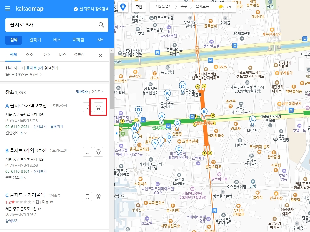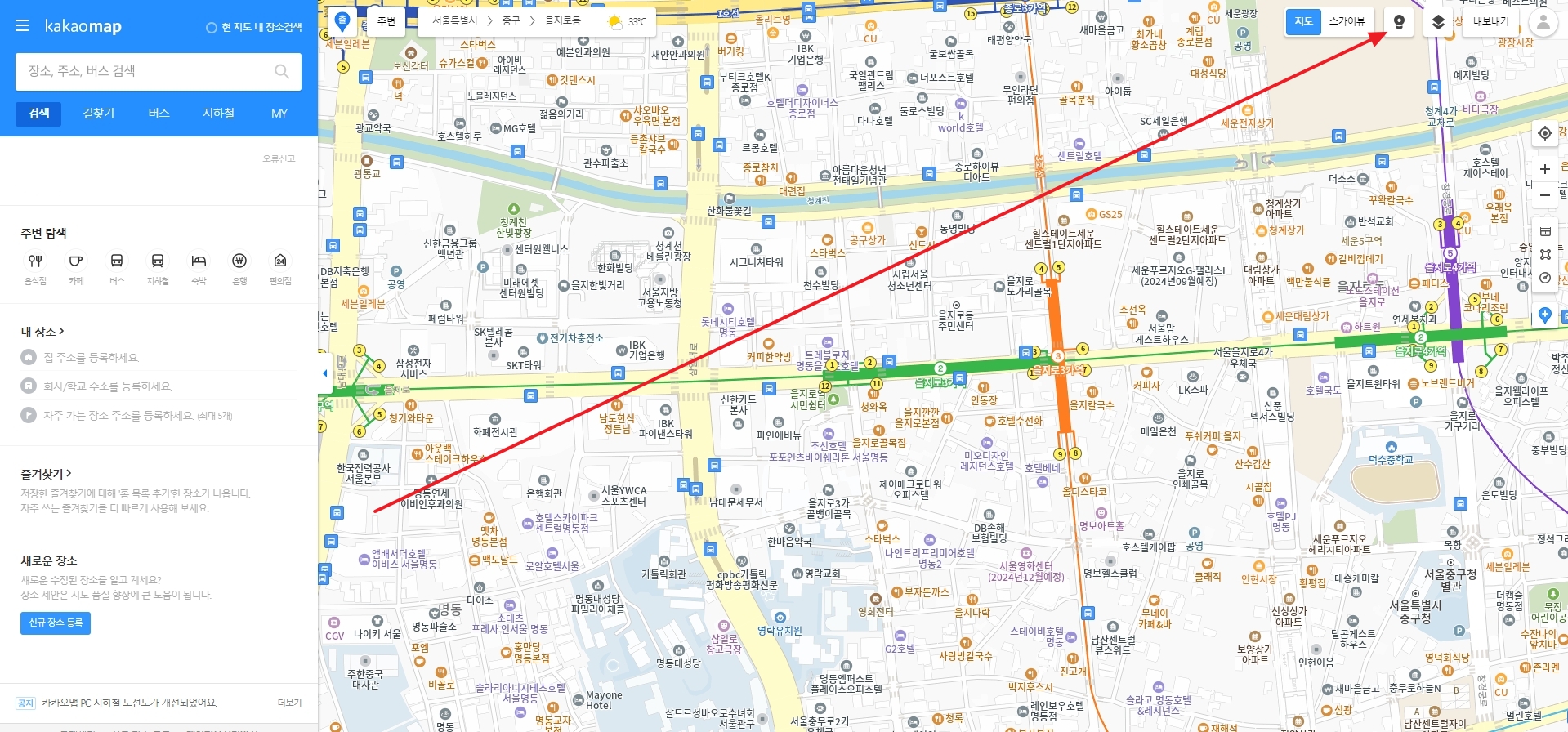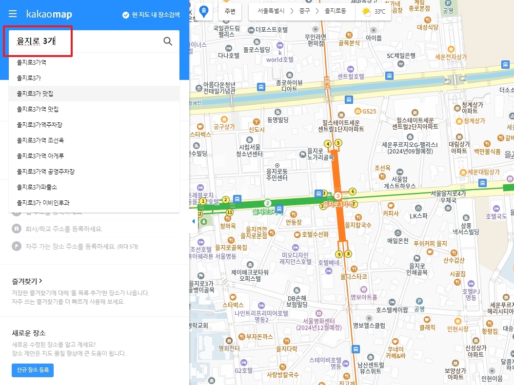 상단 검색창에 확인하려는 장소명(예: 을지로)을 입력해 검색합니다. 장소명이 모호하면 근처 건물명이나 도로명까지 입력해야 정확한 결과가 나오며, 검색어 자동완성 기능을 활용하면 더욱 편리합니다.