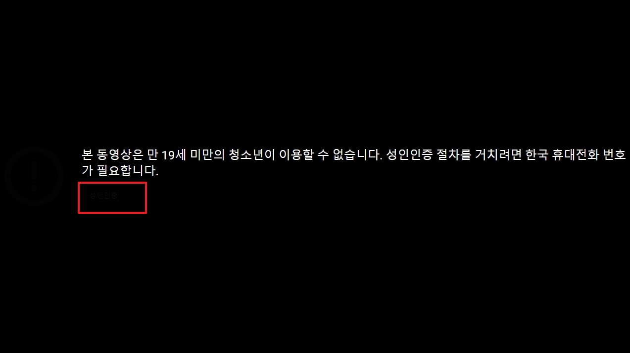유튜브 본 동영상이 '만 19세 미만의 청소년이 이용할 수 없습니다. 성인인증 절차를 거치려면 한국 휴대전화 번호가 필요합니다'라는 안내 문구와 함께 표시됩니다. 이 화면에는 인증 버튼이 눈에 보이지 않지만, 빨간색 네모로 표시된 동일한 위치에 숨겨져 있으므로 해당 영역을 클릭하면 인증 절차로 이동할 수 있습니다.